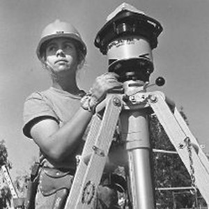 Woman wearing hard hat stands behind laser surveying device.
