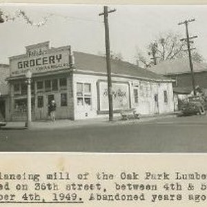 Pallady's Grocery in Oak Park. Old Planing Mill of the Oak Park Lumber Company. Caption on binder page.