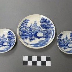 Dinner plate set. Dinner plate, saucer, & dessert plate. Blue pattern. Country scene with water and bridge. Manufactured by Nasco, "Lakeview" Japan.