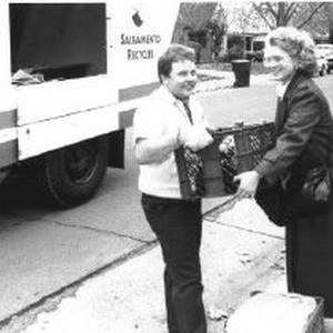 Young man assists woman with getting her recyclables into truck marked "Sacramento Recycles."