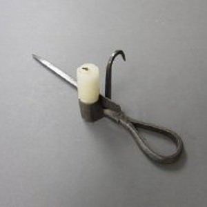 Iron candlestick with candle. Spike and hook for mounting in wall of mine. Not dated.