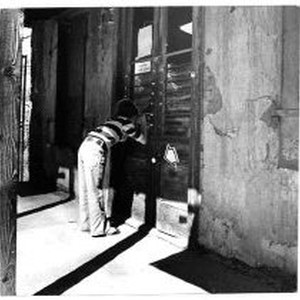 Boy looking through a window in a door into a store in Fiddletown, California.