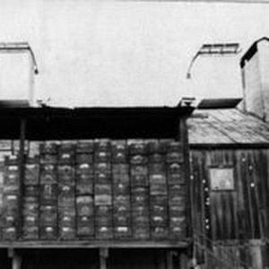 Photo--black and white Fruit dryer and packinghouse in west Sebastopol, CA. Apple boxes line the dock . The rectangular chimney is seen at the right.