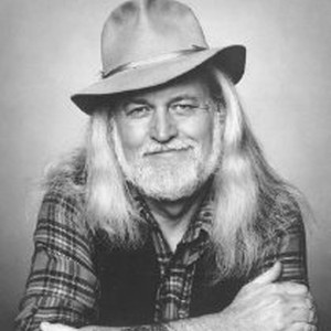Promotional photo of a performer with long grey hair and tatoos. He wears a plaid shirt, vest and felt hat.