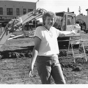 "B.J. Ford at future site of Open House Plaza." Construction in progress behind her.
