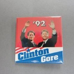 Square shape. White/blue text on red background. "'92 Clinton Gore" w/photo of waving Clinton & Gore.