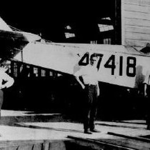 Four workers stand in front of a Jenny bi-plane being manufactured at the Liberty Iron Works plant.