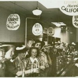Crowd assembles in the old Saddlerock Restaurant on 2nd Street. This is "the oldest place in California - since 1849," according to the signs.