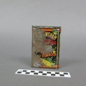 Tin, pocket size, for pipe tobacco, "Buckingham", c.1940s. Label damaged.