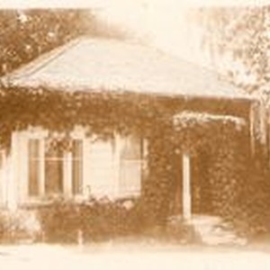 Postcard--Photo, black and white: The vine covered Burbank Experiment Farm cottage in Sebastopol. A vintage car is seen to the right.