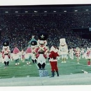 A Chrismas parade and pageant with Santa and characters from "The Nutcracker" inside an arena. Large crowd watches.