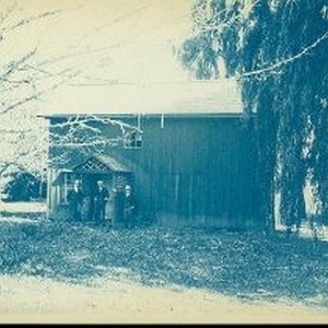 Three men stand in the entrance to a dwelling house at the Chico Forestry Station.