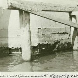 SERIES. View of pier #2 with "concrete around cylinder washed off" and photo of form preparation.