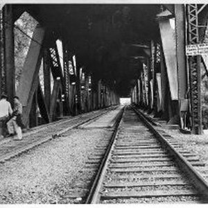 View of the Southern Pacific Railroad Bridge at I Street across the Sacramento River. View looking west shows the railroad tracks on the lower deck of the bridge.