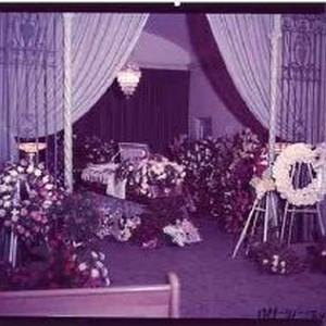 A deceased woman in a casket in a funeral home with floral tributes around the casket.