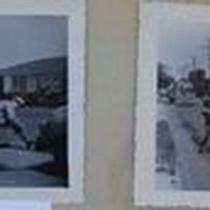 Photo--Black and white: Sebastopol Lions Club scrapbook photos of their float for an Apple Blossom parade, about 1960s. Left photo: Phil Wetch, Tom Klinker, Ted Schoen, unk, Jack Fore.