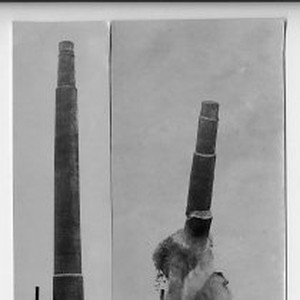 Exterior view of the Sacramento Brick Works and its smokestack at 1300 Front Street as it is demolished.