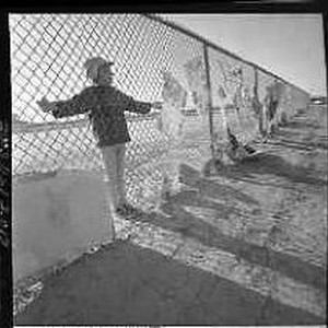 1966 - Children - Kid standing next to cyclone fence with papers plastered against it.