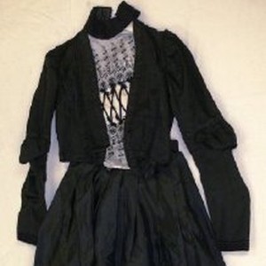 Three piece dress of a black silk broadcloth bodice, a skirt and petticoat. The bodice appears to be contemporary to late 19th century; high neck with pleated velveteen, full length sleeves decorated with vertical pleats and floral applique; front of bodice has ivory-colored satin insert covered with black lace and black velveteen ribbon in a criss-cross pattern; overlaps with hooks and eyes. The skirt and the petticoat are reproductions of modern construction made of synthetic taffeta.