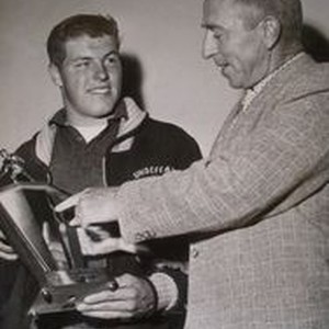 Photo--Black and white: Analy High School Tigers Football, 1960. Analy player John Condon and Coach Walt Foster with 1960 Redwood Empire Allstar trophy for lineman.