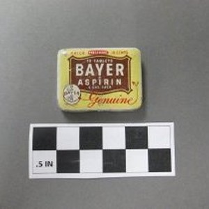 Aspirin tin; metal; yellow, brown, red, and white. Empty tin designed to hold 12 aspirin tablets. "12 Tablets, Bayer Aspirin, 5 Grs. Each, Genuine, Price 15 Cents", additional text on bottom of tin describes product, dosage information, and manufacturer's information.