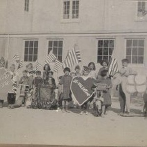 Children standing to display handmade costumes, signs, props, and flags. Older helpers present, two-storied building directly behind.