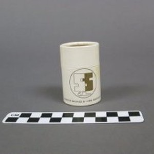 Matchbox, cylindrical, cardboard, white, printed on side "Senator Savings & Loan", orginally held matches.