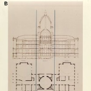 Longitudinal Section drawing of California State Capitol at top. Second Floor Plan at bottom.