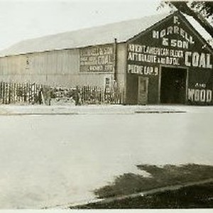 SERIES. View of the barn-like warehouse of this coal and wood company, from across the street. Includes view of storage yard to west.
