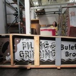 Double sided blade neon sign in the shape of a hand saw. The handle is painted brown. The saw blade has a white background with the words Buletti Bros painted in brown and "FILING & GRINDING in white. White neon tubing traces saw edge and Filing & Grinding. Neon from the words Buletti Bros. appears to be missing.