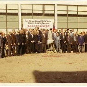 Crowd of dignitaries gather in front of a sign announcing "Sun Yat-Sen Memorial Hall Ground-Breaking Ceremony" in Chinatown.