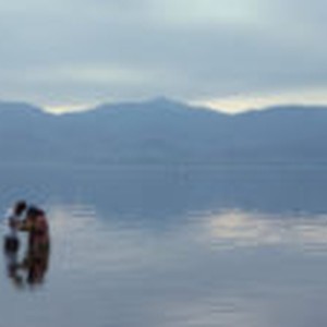 Students John B, Julie, and Stephanie collect samples in the shallow water at Mecca Beach in the Salton Sea with mountains in the background.