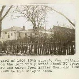 Typed on binder page "Back-yard of 1808 13th street, Jan. 29th, 1941. Tree on the l eft wasa planted about 30 years ago.Picture was taken from Siller Bros. oldlumber yard next to Mrs. Haley's home."