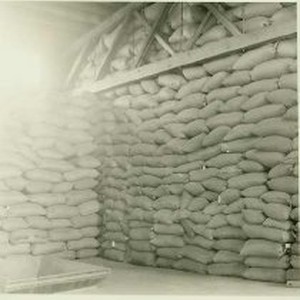 View of some of the almonds stacked in bags. Note that they are stacked to the ceiling.