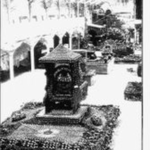Postcard--photo--black and white: Sebastopol's Gravenstein Apple Show display of a shrine-like structure made of apples. Flag with the words ." . . Of the Golden state of …" 1915.