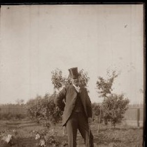 Unknown man dressed in formal wear, top hat, tails, and a cane standing in an orchard