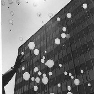Large group of adults and children celebrate the reopening of the Memorial Auditorium by releasing white balloons en masse. Oragami birds attached to each balloon by a string. Doves also released.