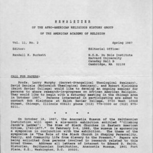 Newsletter of the Afro-American Religious History Group of the American Academy of Religion, vol. 11, no. 2 (Spring 1987)