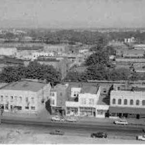 Overhead photo probably taken from rooftop of California Fruit Building looking West towards river.