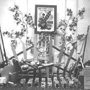 Window display at Weinstock's advocates, "Raise vegetables for Victory. Start a Victory Garden and help in the war effort." Includes seed packets, garden tools and vegetables.