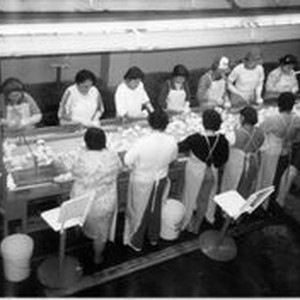 Photo--black and white: Women workers standing on the apple line at Manzana Products in Graton.