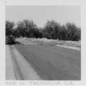 Street scene showing the end of Tartanilla Circle in Citrus Heights showing the part that is paved and the remainder that is not.