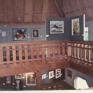 A view of the upper and lower floors of an exhibit hall, with numerous paintings hung on interior concrete walls. The second floor is open in the center with a wood railing along the walkway and open wood ceiling. Photograph is glued on white paper and was removed from file folder, Organization Activities, Sacramento Branch, Art Exhibits 2003/051/031.