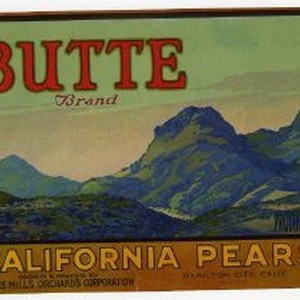 Butte Brand California Pears, James Mills Orchards Co., Hamilton City, Calif. Scene showing buttes, word "Butte" lettering in red.