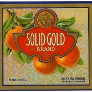 Crate label. Solid Gold Brand , Rocky Hill Ranches, Exeter, California. Cluster of oranges behind red seal.