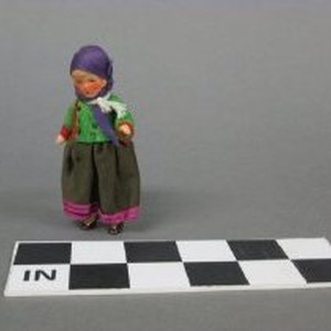 Female ceramic jointed doll wearing Dutch costume. Accompanies .249. Wearing green flannel dress with brown overskirt and purple headscarf.