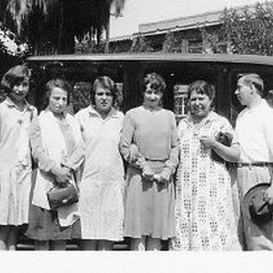 SERIES. Group of five women and one man pose in front of an automobile. Mary and Pasha are 3rd and 5th from left in first photo.