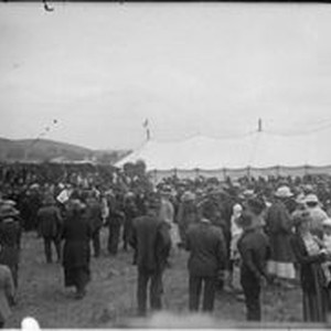 Negative glass-plate photo: From a glass plate negative made by William Borba. Gravenstein Apple Show exhibit circa 1915 in Sebastopol. A large crowd outside the tent at the Apple Show.