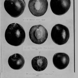 Photo, black and white: Burbank Plums, three rows of whole plums and plum halves with captions. "0-20 (Entire tree) XXXX,"" L-40 (Entire tree) "Odd Bartlett) XXX,""YY-4 (East Branch) "Sky Blue" XXX."