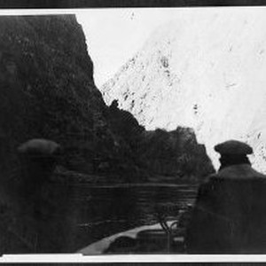 Album of the "Colorado River Trip" December 5 to 12, 1925. Consulting Engineering Committee to Water Resources Investigation. Division of Engineering & Irrigation: State Department of Public Works. Photographs by W. L. Huber. Caption under photo reads: "Boulder Canyon dam site looing downstream."